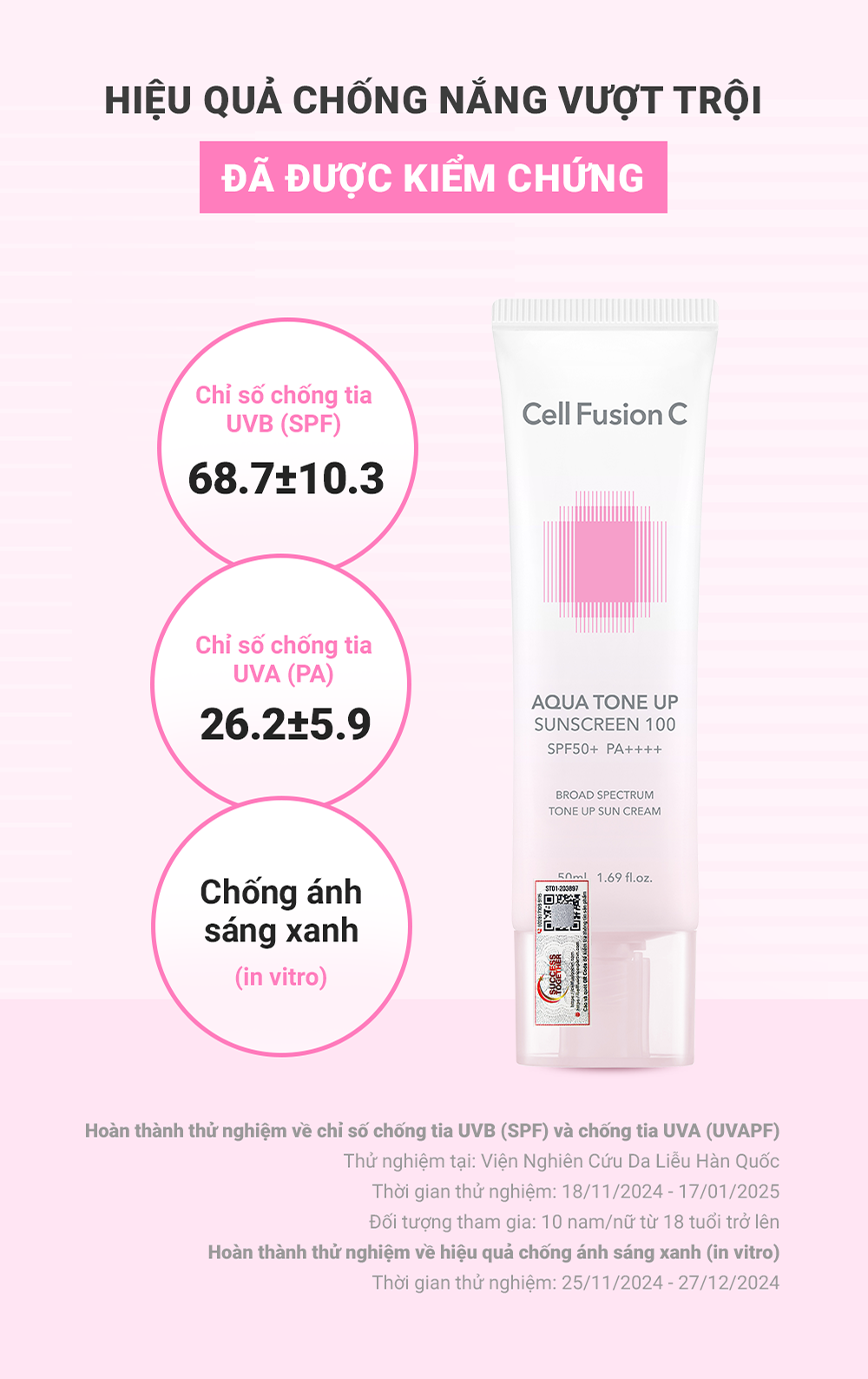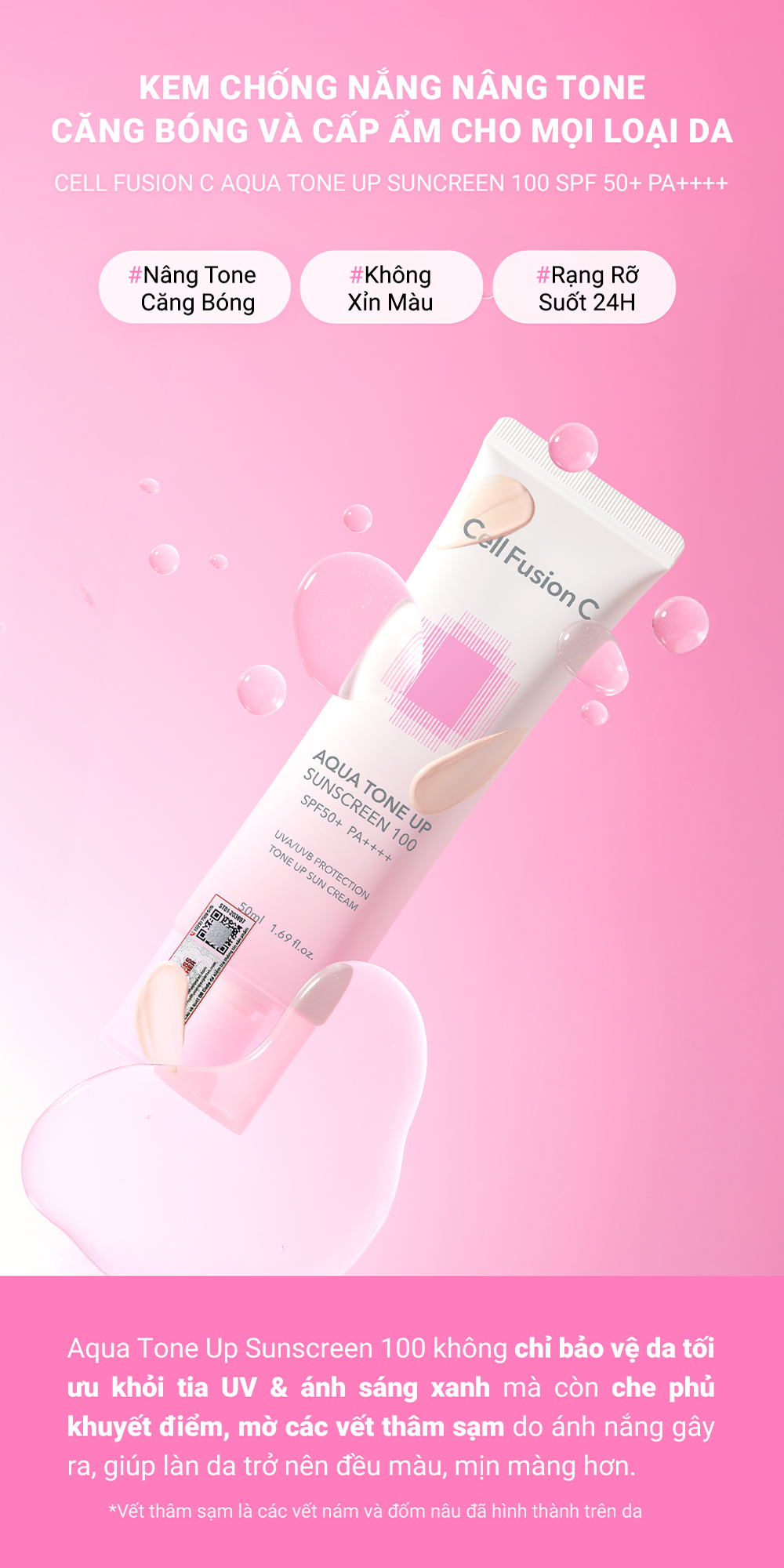 Cell Fusion C Aqua Tone Up Suncreen 100 SPF 50+ PA++++ kem chống nắng nâng tone giúp bảo vệ da trước tác hại của tia UV, đồng thời cấp ẩm dịu nhẹ trên da.