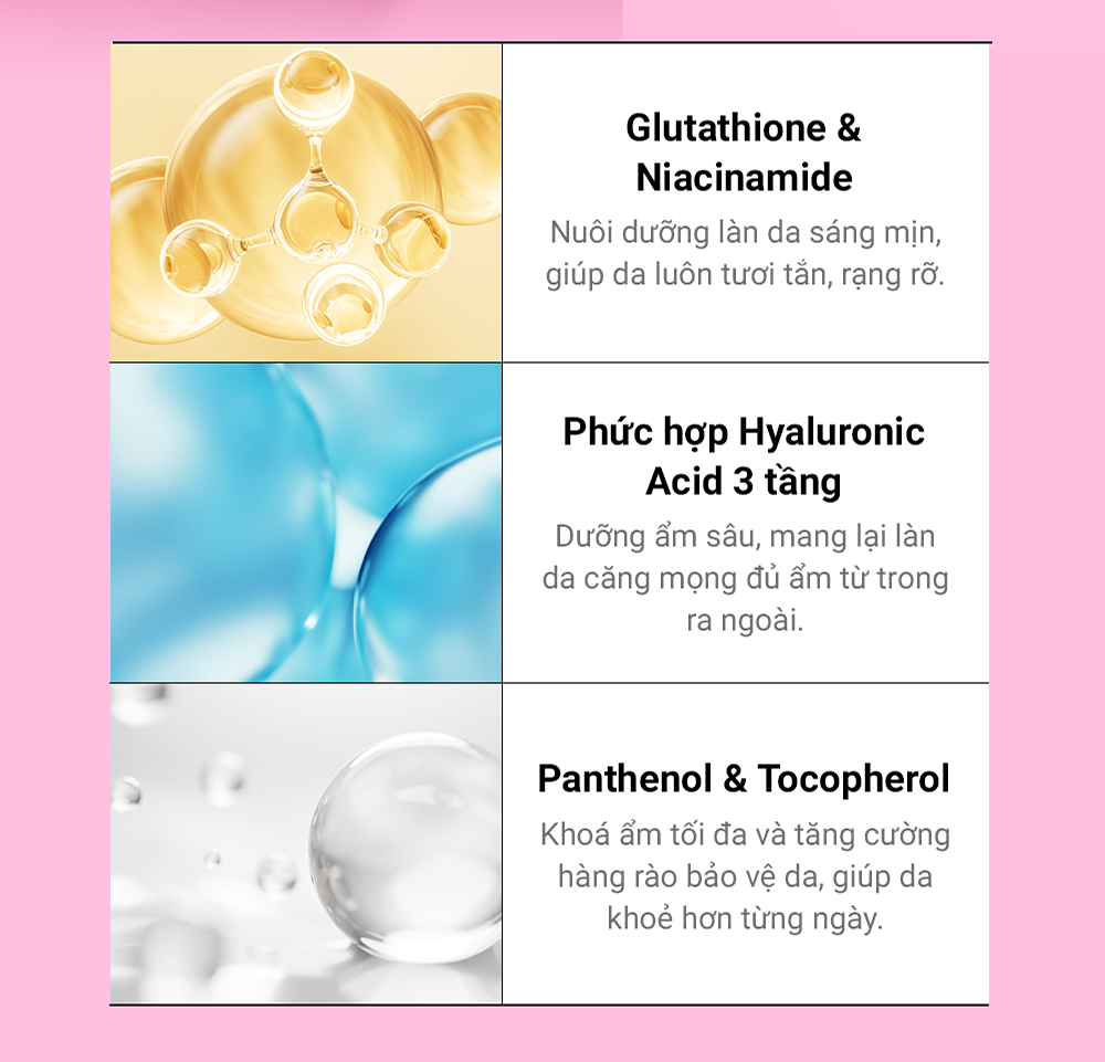 - Glutathione: Chống oxy hóa mạnh mẽ, làm sáng da, giảm thâm nám.
