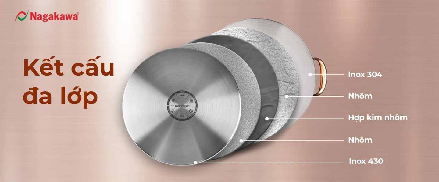 Điểm nhấn của nồi nằm ở cấu tạo đa lớp dày dặn với sự sắp xếp thông minh giữa các lớp kim loại. Sự đan xen giữa Inox 304 - Nhôm - Hợp kim nhôm - Nhôm - Inox 430 giúp cho nhiệt độ được phân bổ đều trên mặt nồi, hạn chế tình trạng truyền nhiệt cục bộ. Cấu tạo đa lớp nâng hiệu suất bắt từ lên tới 98%, hiệu quả nấu nướng cũng thăng hạng, thức ăn chín đều và lưu giữ được hương vị nguyên bản.