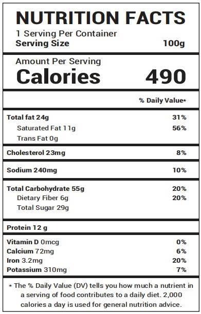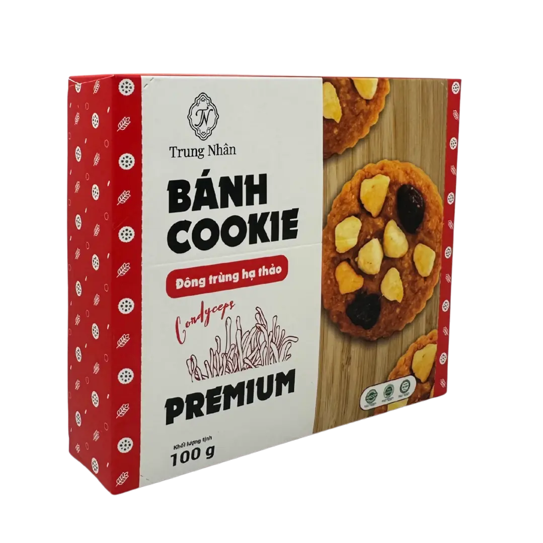 Thành phần: Hạt điều, yến mạch, bột lúa mì, nho khô, đường mía, mật ong, bơ sữa hỗn hợp (bơ lạt), trứng gà không phôi, hạt óc chó, hạt hạnh nhân, nam việt quất khô, nấm đông trùng hạ thảo tươi 5%, bột nở (chất tạo xốp: INS 500(ii) và INS 341(i)), hương liệu vani tổng hợp, muối hồng, chất bảo quản kali sorbat (INS 202)