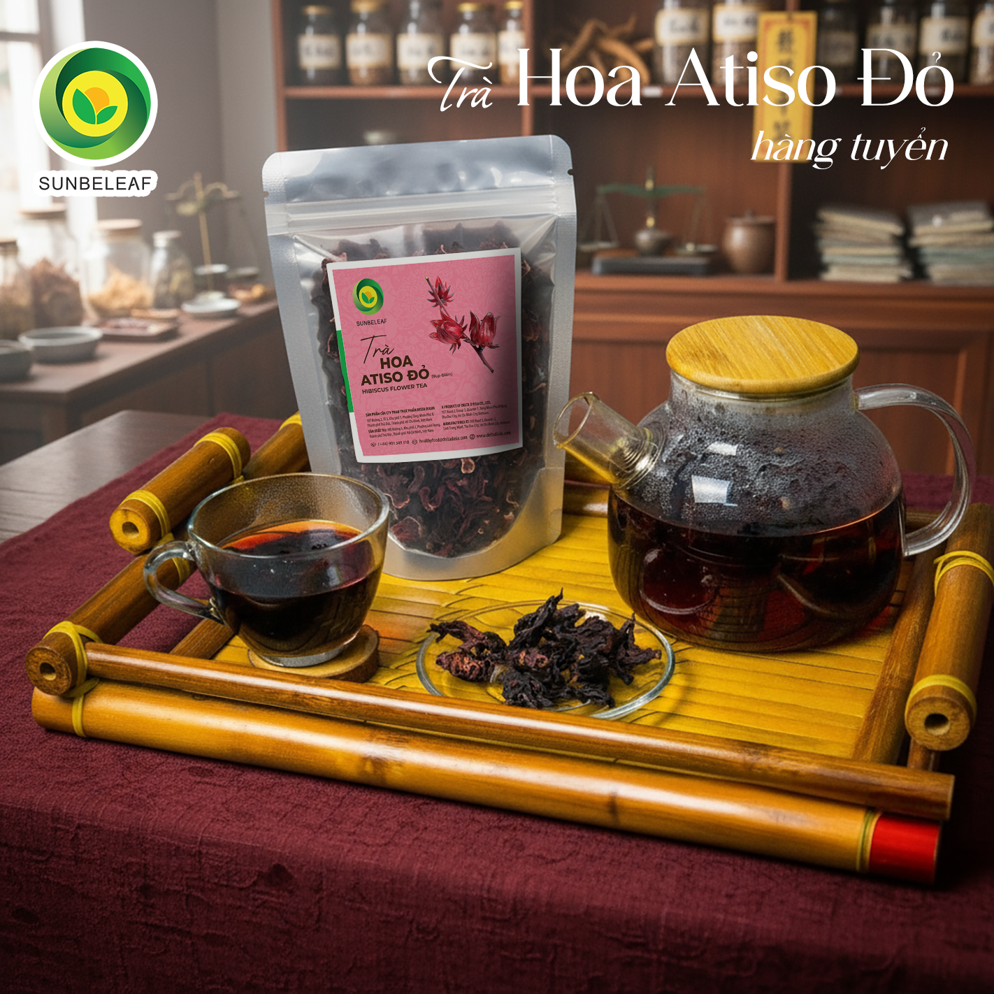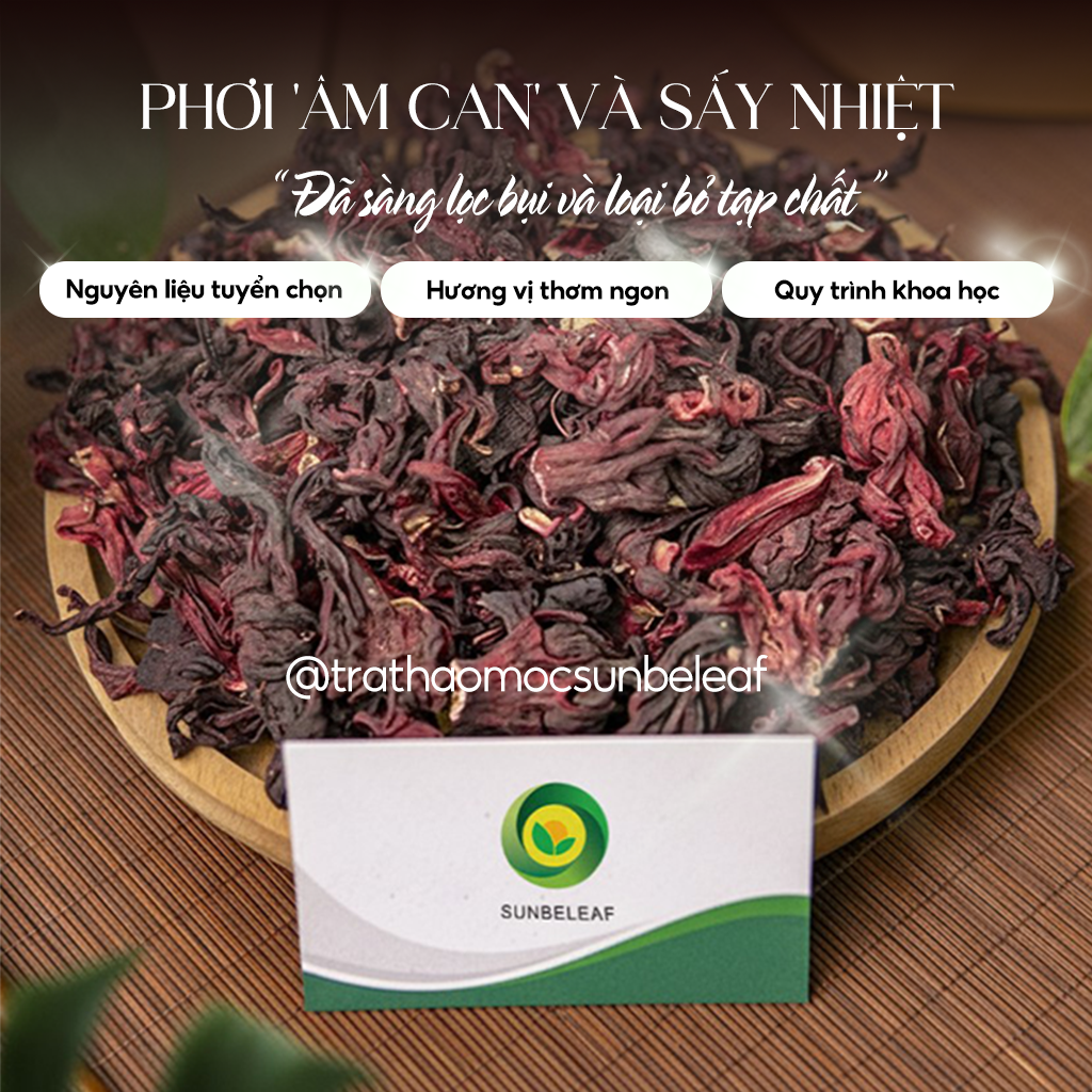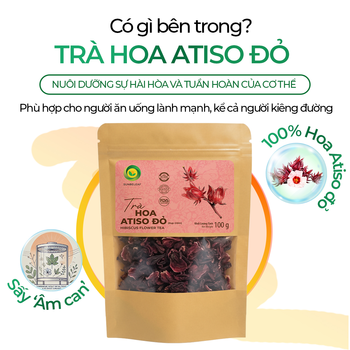 Trà Hoa Atiso Đỏ (Hibiscus) Sunbeleaf là loại thảo mộc có hương vị chua thanh sảng khoái, thích hợp dùng làm trà giải khát hoặc pha siro, trà nguyên bông túi zip 100g